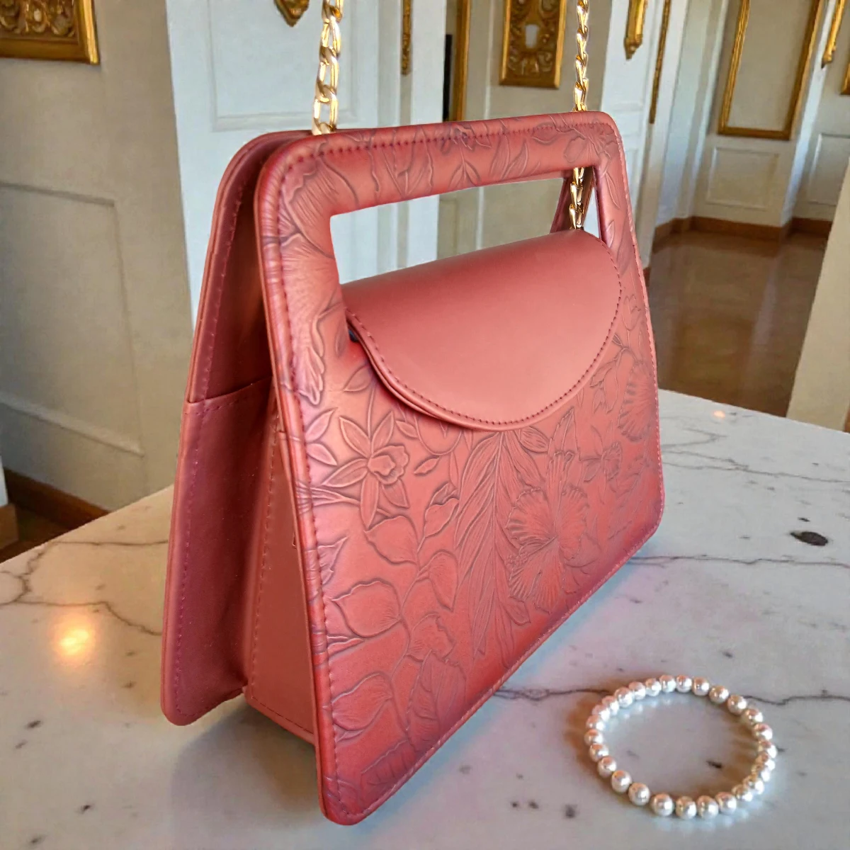 The Embossed Floral Mini Carry Crossbody in brick red features a floral embossed texture, a cut-out top handle, and a long chain + strap for crossbody use. It is lightweight, stylish, and easy to carry for daily outings.