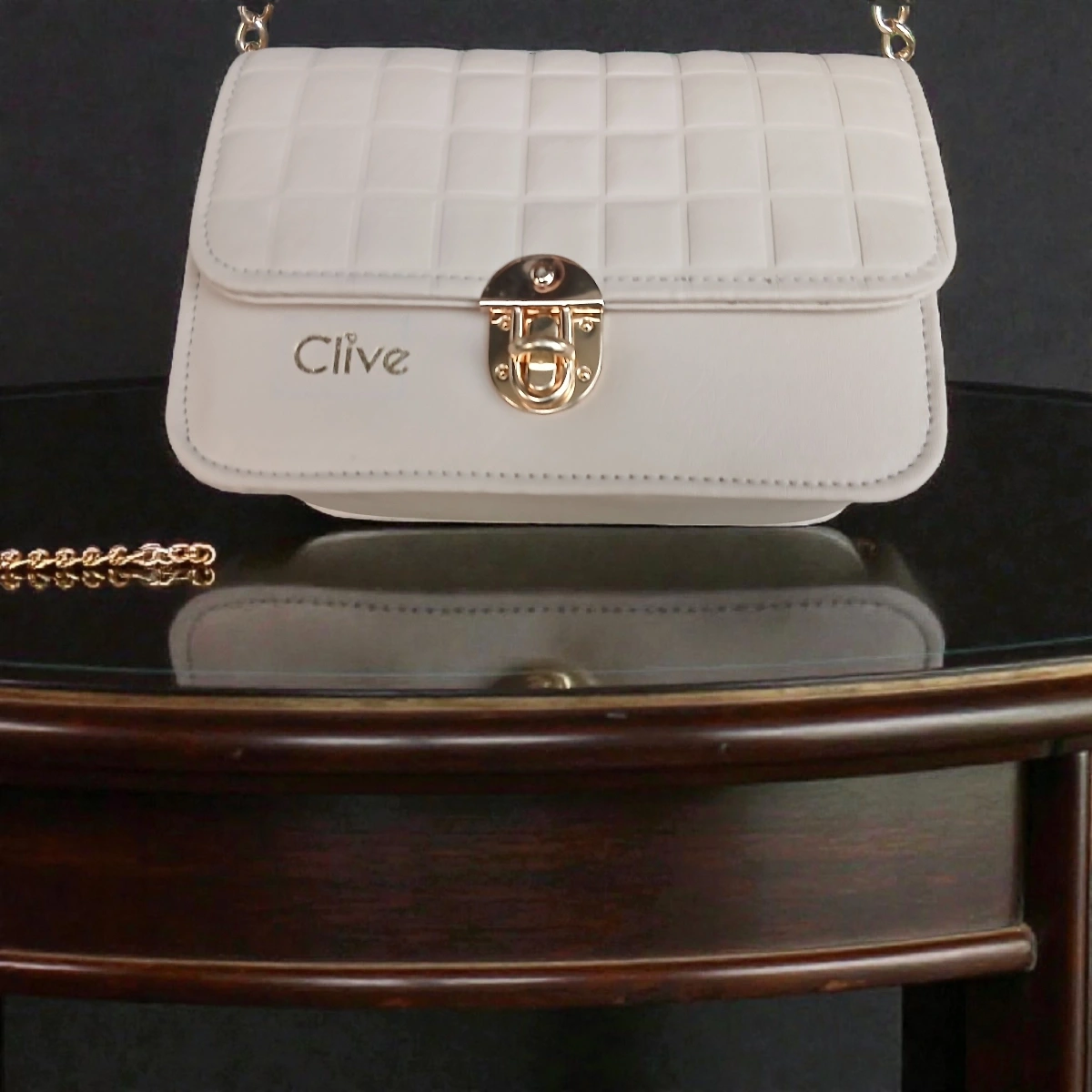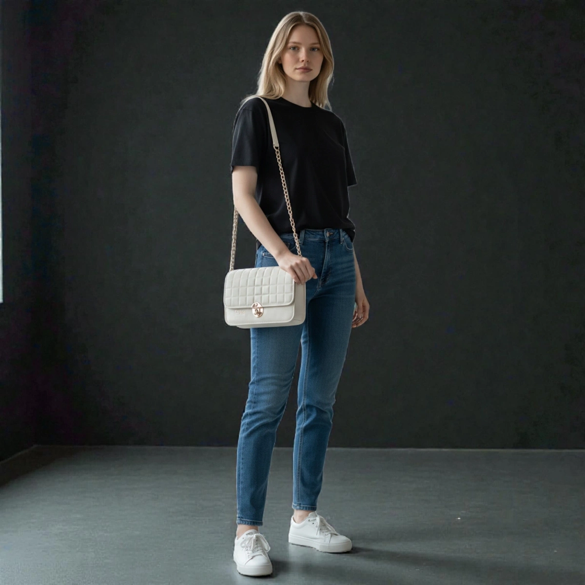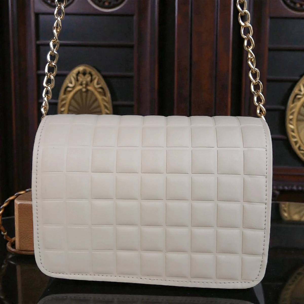 Embossed Grid Leather Flap Chain Crossbody – Ivory White is a sleek and elegant crossbody bag crafted in smooth leather with a refined embossed grid design and gold chain strap.