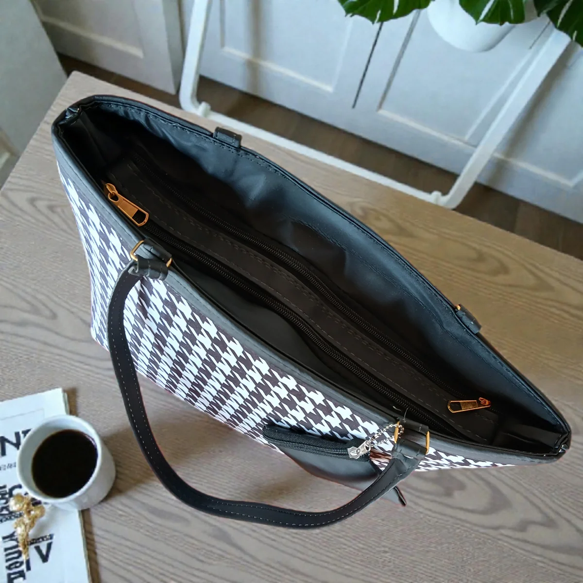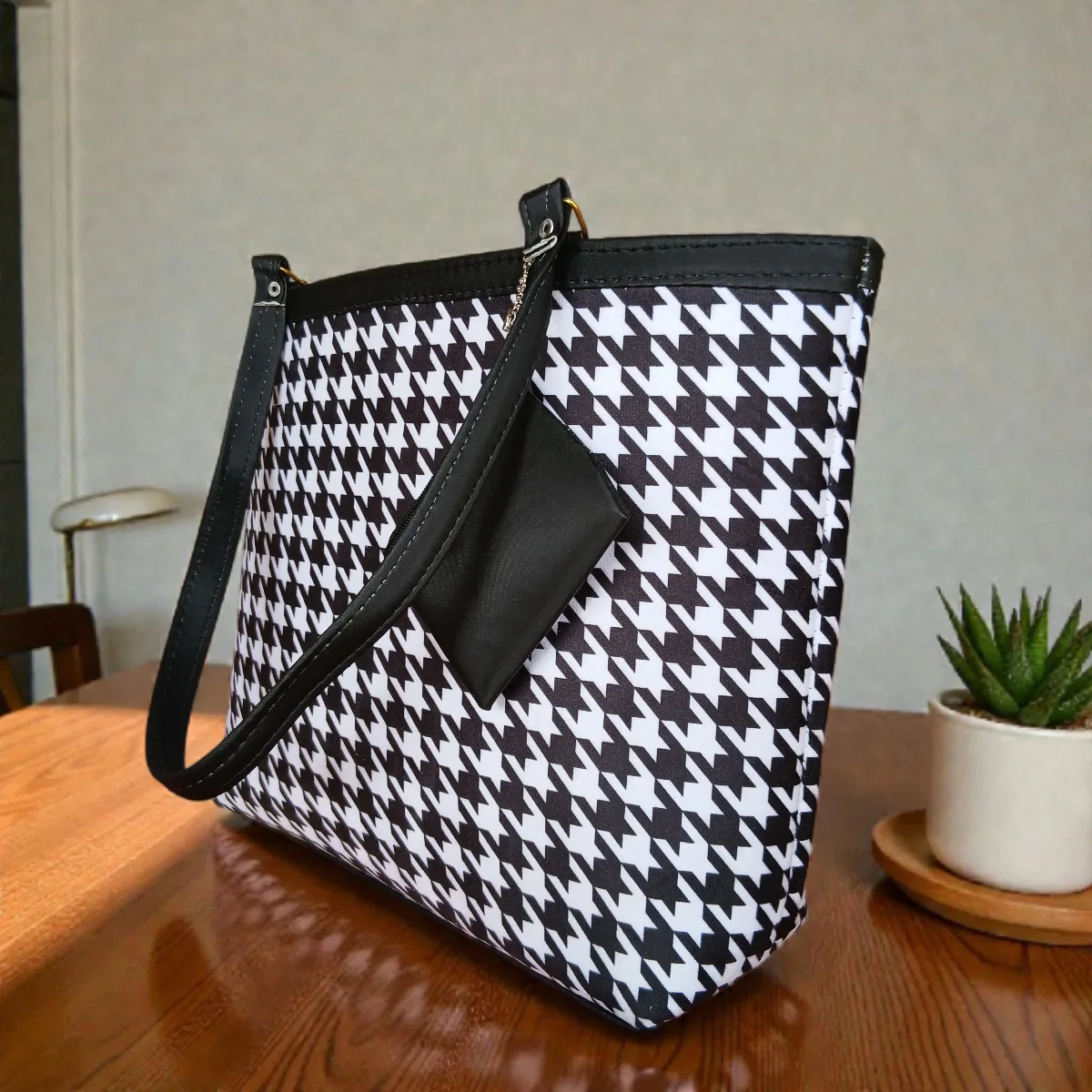 Stylish black and white printed ladies tote bag with a leather-finish body and bold houndstooth print.