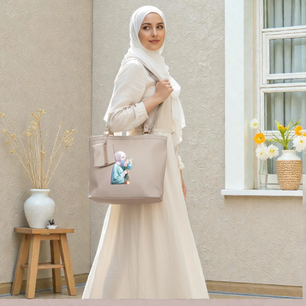 Stylish printed ladies tote bag with a leather-finish body. It features two large zip compartments, long shoulder straps, and a detachable zip pouch. Perfect for daily use and shopping.