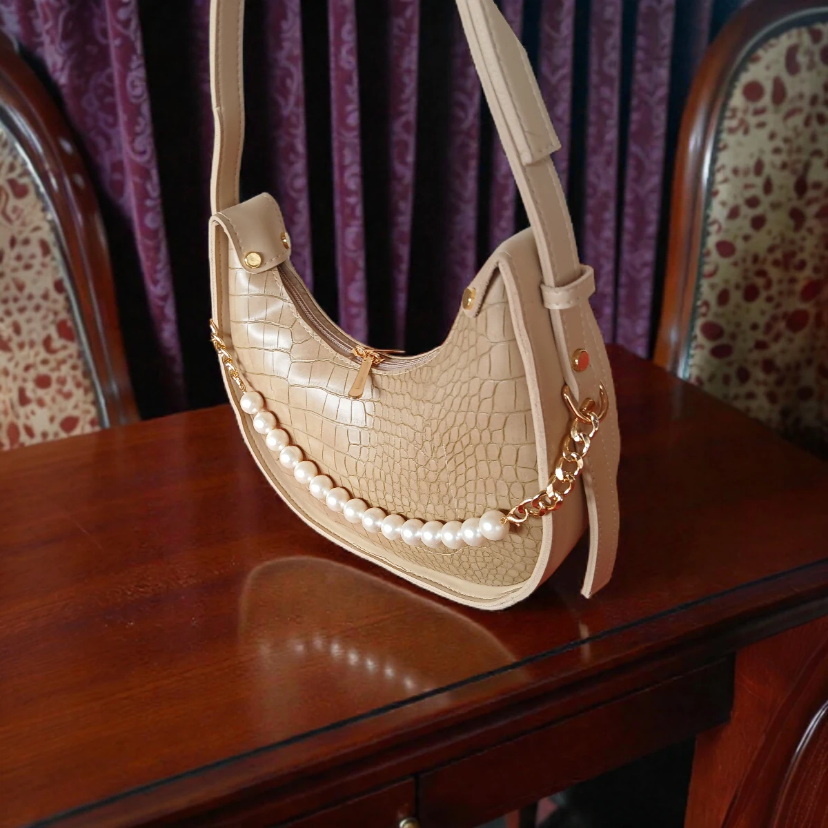 A stylish textured crossbody bag featuring elegant pearl chain detail. Designed with a single main compartment and a small inner pocket to keep essentials organized. The adjustable strap allows comfortable shoulder or crossbody wear, making it ideal for daily use and casual outings.