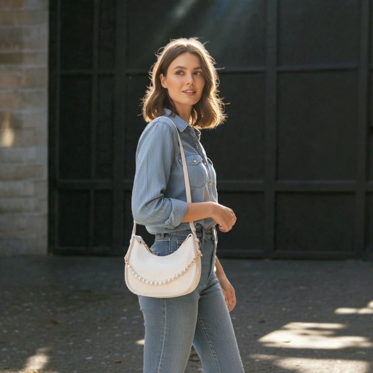 Textured Pearl Detail Crossbody Bag – White